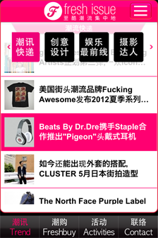 在全新的Fresh Issue App,为年轻人提供最新鲜的潮流资讯、活动以及潮人动态。